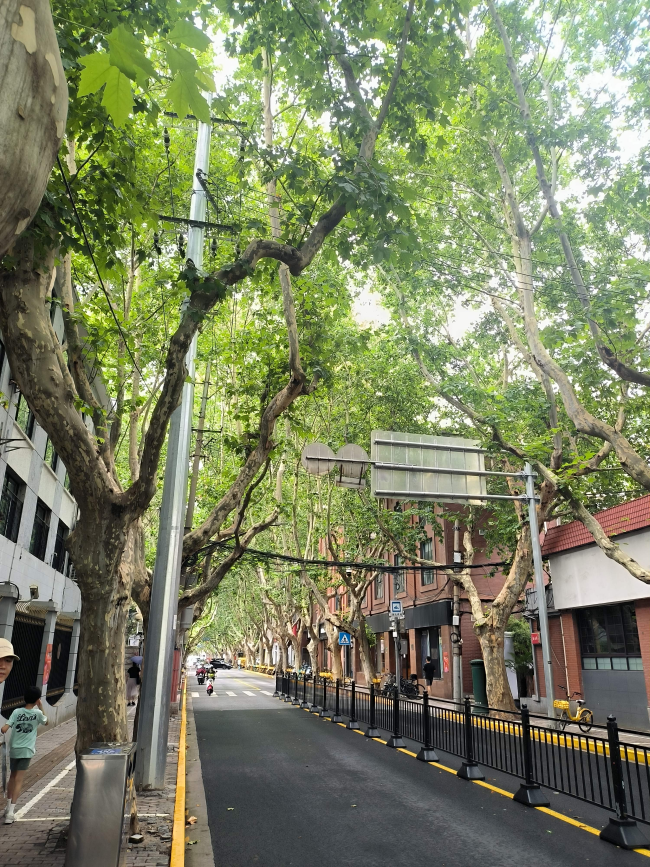 上海法租界 的街景特色: 法國梧桐(Platanus × acerifolia):正是法租界區域最具代表性的行道樹。這些樹是上世紀初引進的,如今已經成為上海城市景觀的標誌。 綠蔭隧道:樹木枝葉相互交錯,把馬路遮成一條天然的綠色長廊,夏天走在裡面特別涼爽。 歷史建築與騎樓:照片裡的紅磚建築和街邊小店,也都是法租界常見的風格。 很多人說,走在這樣的街道上,有一種中西文化交融的懷舊氛圍。✨